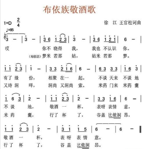 酒歌的曲调节奏明快,是聚会的必备之歌。歌词内容不限,歌唱者自由发挥,唱酒歌是布依族喝酒助兴的一大特色活动。