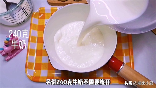 另取一个容器,倒入240克的牛奶,加热到烫手就可以了,不需要烧沸。其实放微波炉里热一下刚好。