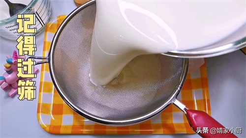 搅拌好的奶液记得一定要过筛,这样做出来的奶冻口感才会更细滑。