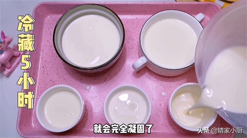 倒入容器中冷藏5个小时以上至奶液完全凝固,奶冻就做好了。 可以头天晚上做好放冰箱里第二天早上就可以吃了。