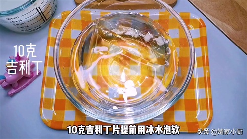 吉利丁片先用冰水提前泡软,如果是夏季,泡的时候一定要放在冰箱里冷藏浸泡。