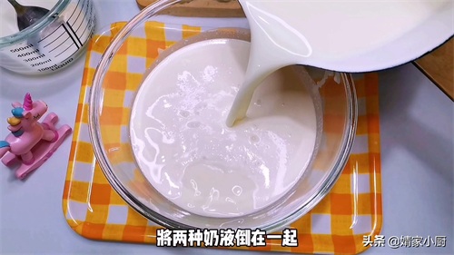 碗中倒入140克牛奶,100克动物奶油,80克植物奶油,50克炼乳,搅拌均匀备用。 所用的牛奶可以是液体奶也可以是奶粉,如果用奶粉可以冲调的稠一些,做出来奶味会更香浓。