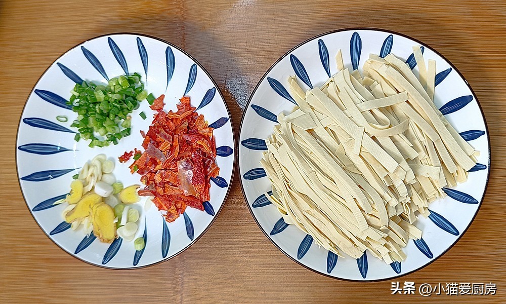 【步骤一】:把干豆腐切成和筷子粗细的条装盘、同时把生姜和大蒜切片、大葱切成丝、香葱切成末、干辣椒切成小段,分别装盘备用。