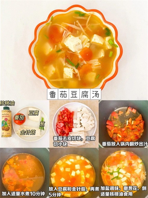 准备材料:核桃油 金针菇 番茄 豆腐 葱
