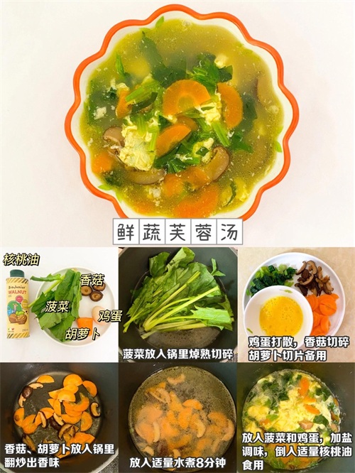 准备材料:核桃油 菠菜 香菇 胡萝卜 鸡蛋
