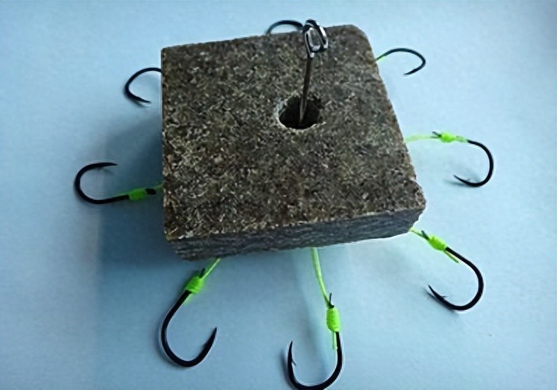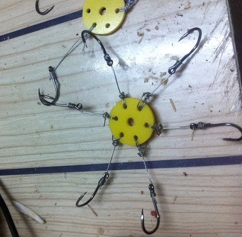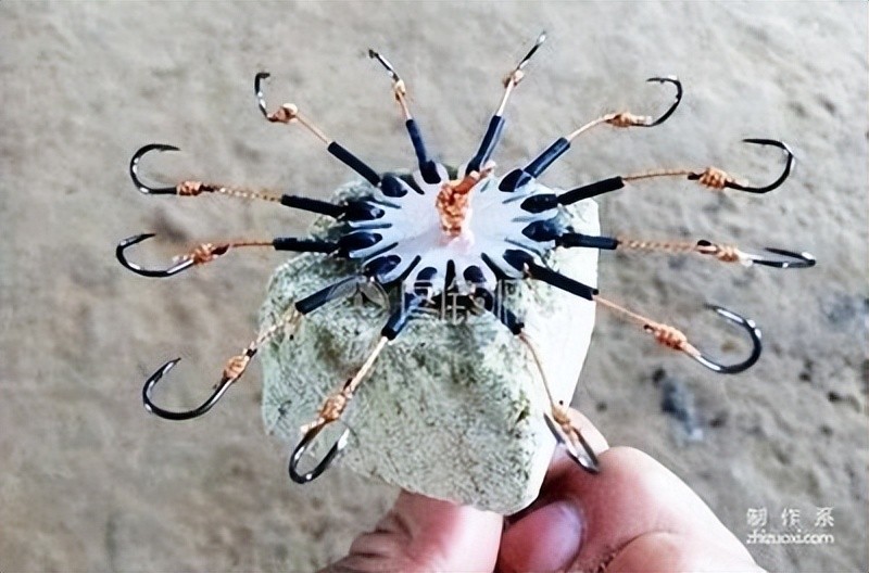 1.六通钩的制作。用钢锯从直径30毫米的尼龙棒上锯下5毫米厚的圆饼一块,在其中心钻一直径为4毫米的孔,再沿周边六等分,并向中心孔各钻一个直径为1毫米的小出线孔。取6段直径为0.5毫米的钓线,其一端系一枚伊势尼12号钩,另一端分别从小出线孔穿进去,都从中心孔中抽出来;在脑线加钩柄全长不超过50毫米处分别打结。调整钩的方向以后,再捏住钓钩往外拉紧,使线结隐蔽在中心孔内。至此,六通钩就做好了。但为了携带方便,找一块直径为140毫米左右,厚度为3~4毫米的泡沫塑料块,将六通钩的6枚钩分别舒展地扎进相应的位置上。因为尼龙圆饼的6个小孔有导向作用,所以就避免了钩与钩之间的纠缠。尼龙圆饼要用水煮一下,以便除去杂味。