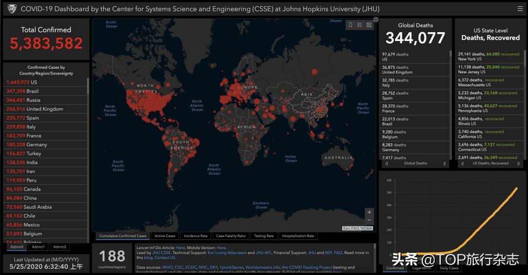据约翰斯·霍普金斯大学的实时数据,截至北京时间5月25日6时32分左右,全球累计确诊超538万,为5383582例;累计死亡超34万,达344077例。