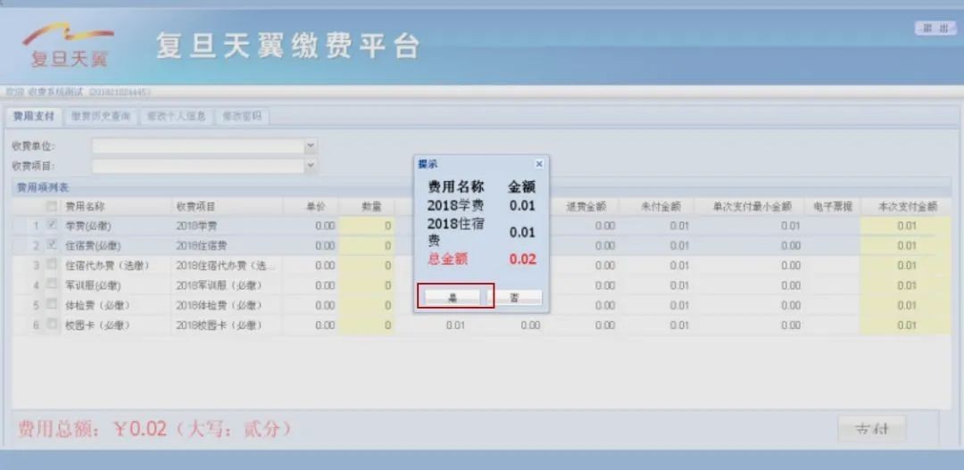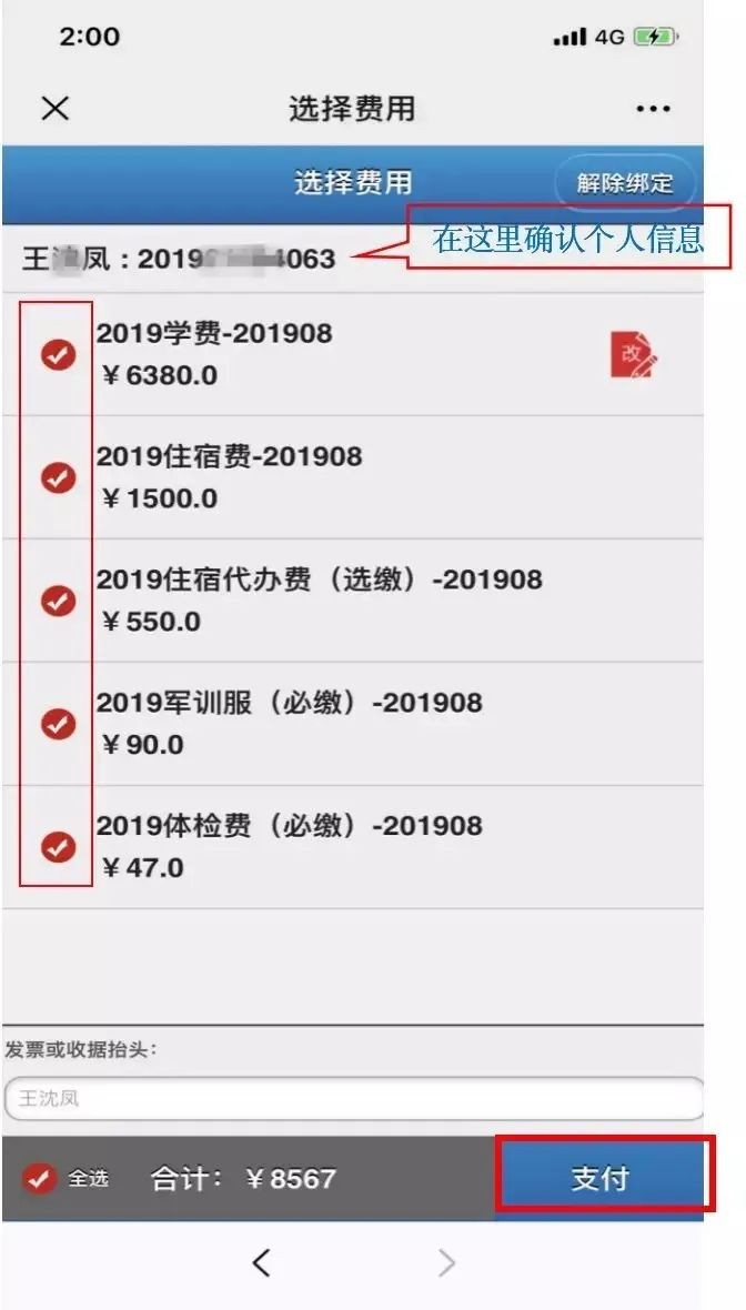 第四步、确认个人信息,选择所需缴纳的费用项,点击【支付】,输入【支付密码】,完成缴费。