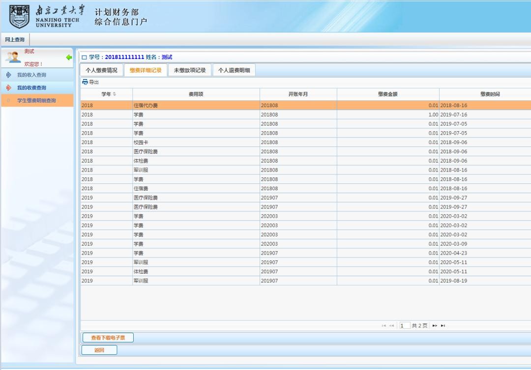 点击【高级财务查询】,选择【我的收费查询】下的【学生缴费明细查询】,勾选相关记录点击【查询明细】,点击【查看下载电子票】,可查询下载已缴费电子票据。