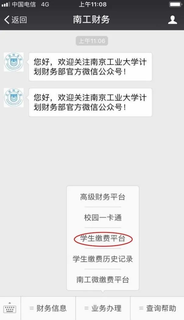 第二步、在“南工财务”公众号点击【业务办理】—【学生缴费平台】,或者在“南京工业大学”公众号点击【录取查询】—【学生缴费平台】。
