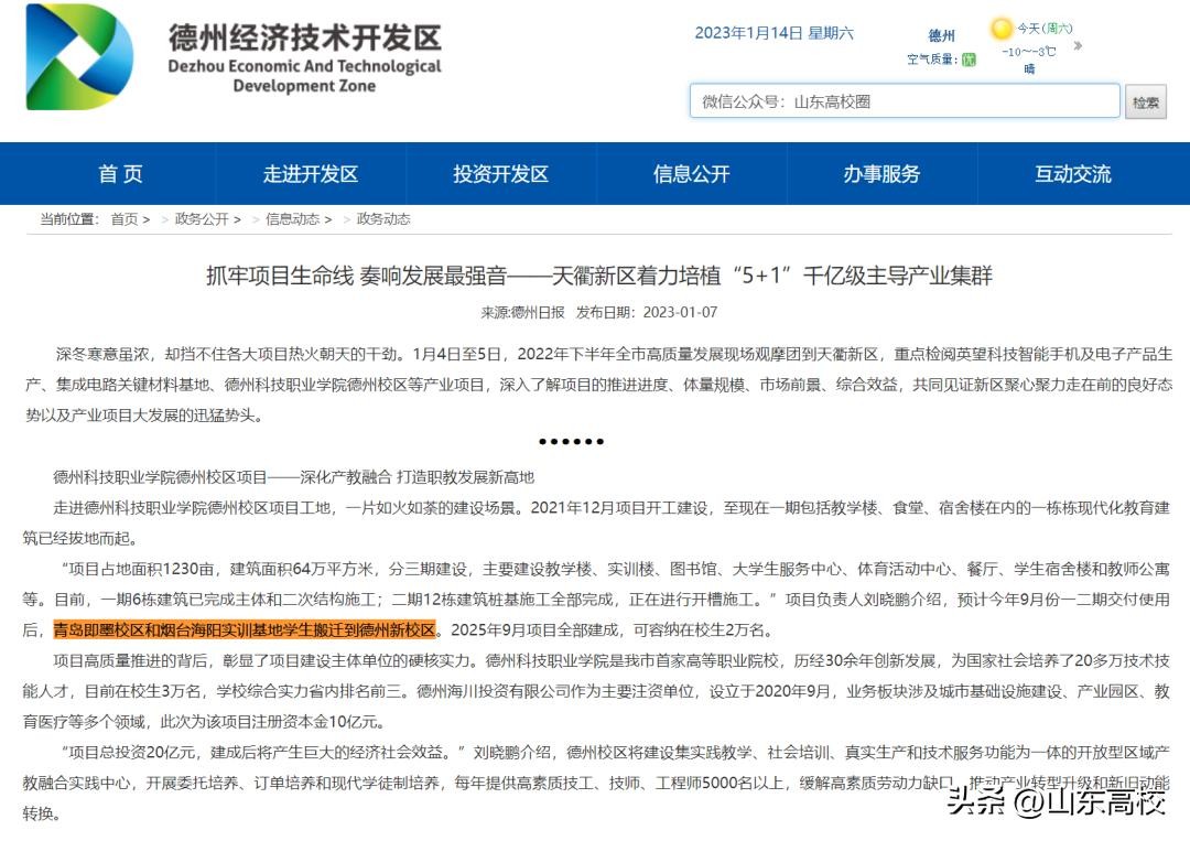 2023年1月7日,德州天衢新区公众号和德州经济技术开发区官网发布文章《抓牢项目生命线 奏响发展最强音——天衢新区着力培植“5+1”千亿级主导产业集群》,再次提到:预计今年9月份一二期交付使用后,青岛即墨校区和烟台海阳实训基地学生搬迁到德州新校区。