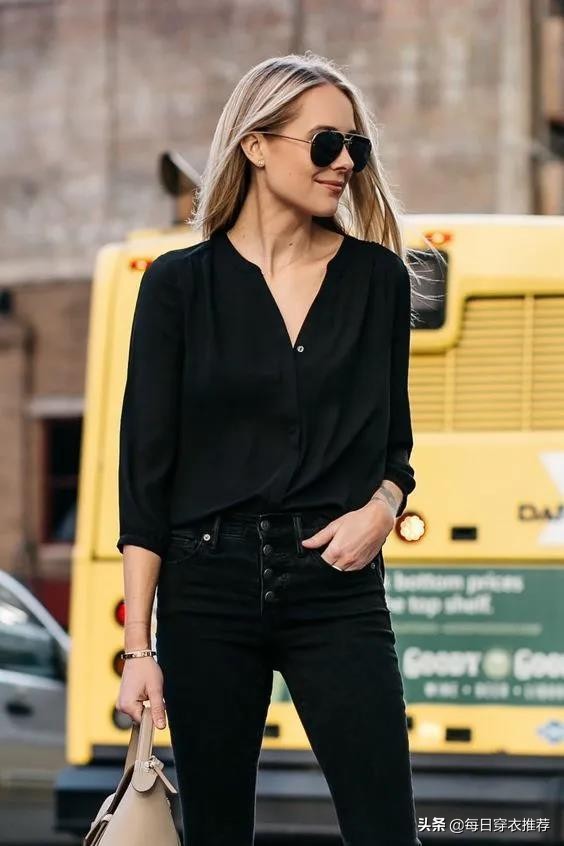 黑色除了神秘感,干练优雅也是其显著的优点,黑色西装面料的服饰职场女性爱不释手。黑色的简约服饰最初就是为OL设计的,黑色衬衫、黑色西装听起来非常的单调。通勤风格的黑色穿搭需要巧用配饰,搭配精美的胸针或者解开几粒扣子,内敛、低调又不缺乏精致感,瞬间提升了穿搭品味。