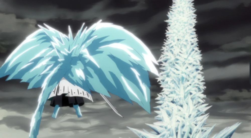 始解后刀身未消失,出现月牙形刀刃通过锁链与刀柄相连,月牙形刀刃可自动攻击敌人。可以通过斩魄刀释放寒冰对敌。由寒冰施展的相关技能:群鸟冰柱,冰龙旋尾,冰龙旋尾·绝空,棱壁冰阵,真空冰刃。