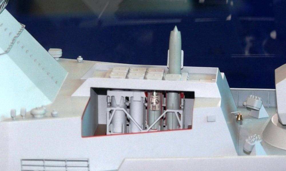 将设置4具8单元通用舰载垂直发射系统,装备16枚Kh-35巡航导弹、 16枚3M14 “口径”、“缟玛瑙”-M或3M22“锆石”巡航导弹。