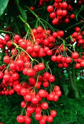 树上挂满了一串串红色的果实。红色外壳包裹着几颗黑色、略带油光的籽。在阳光的照耀下显得更加晶莹亮丽。