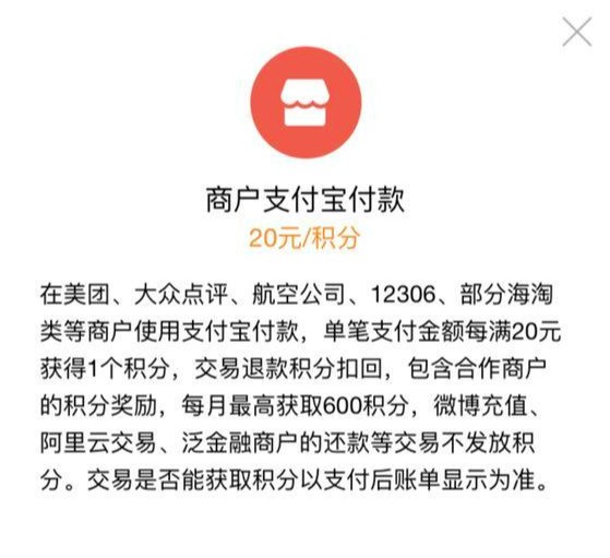 国内外门店买单、带车出行、线下购物使用支付宝,单笔支付每满20元可获得1个积分,月限700分,其中扫收钱码月限150分。