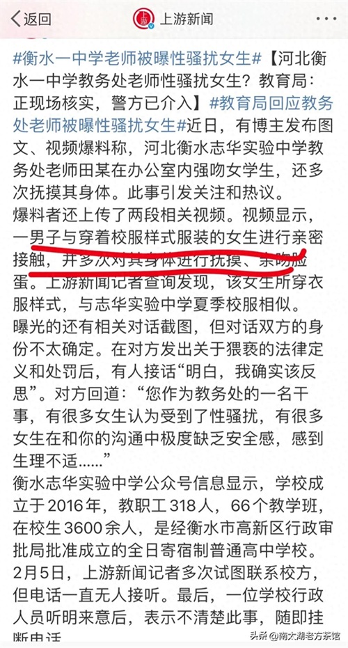有博主发布图文、视频爆料称,河北衡水志华实验中学教务处老师田某在办公室内强吻女学生,还多次抚摸其身体。