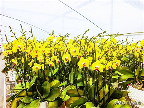 花架之上,一朵朵形色各异的蝴蝶兰热烈绽放,玫红如烈焰,橙黄似暖阳,雪白若冬雪,淡粉若初樱,仿佛翩翩起舞的蝴蝶栖息在细长的花枝上,美不胜收。苗床之中,一株株不同阶段的蝴蝶兰种苗长势喜人,花农们正在培土、移植、换盆,忙得不亦乐乎。