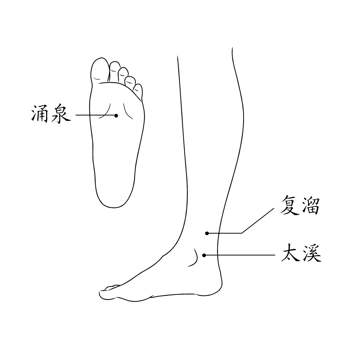 “5”——指的是5个穴位,涌泉,太溪、复溜、足三里和肓俞穴;