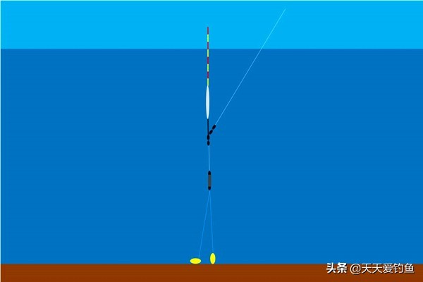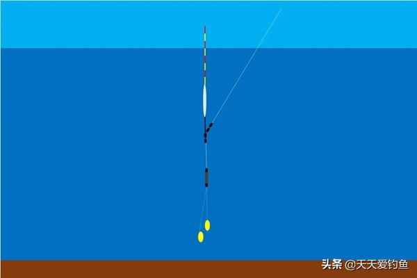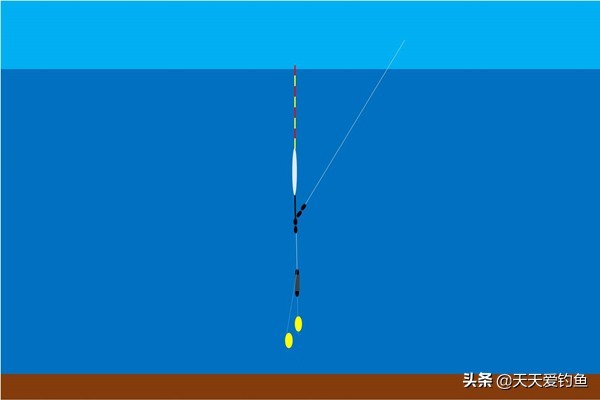 在双饵重是两目的情况下,那单饵的重量就是一目,如果钓目增加到三目,就是下饵躺底上饵开始触底的状态。如果钓目继续增加,那上饵会慢慢从触底变成躺底。