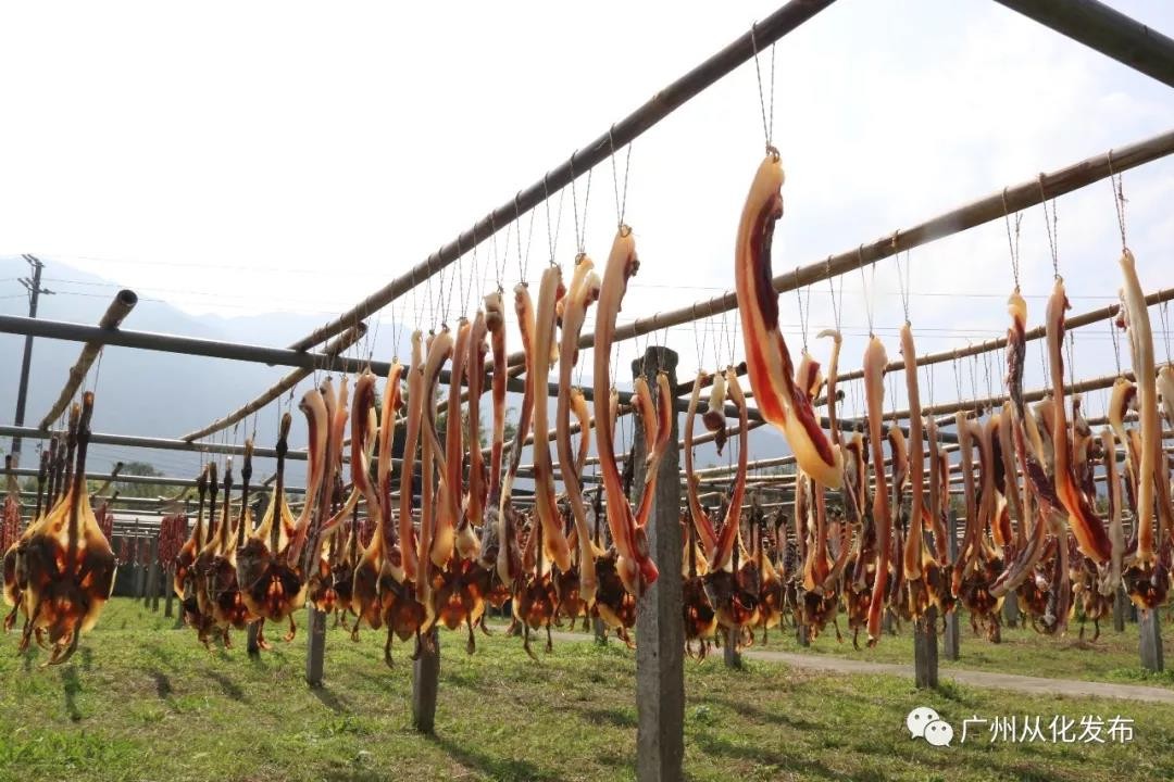 冬来村头腊味香。冬天来到从化,除了可以欣赏挂满枝头的红柿,还有一道风景就是家家门前悬挂的腊味。腊味是广东年节必不可少的一道美味。从化的腊味选自本地农家饲养的土猪、土鸭,由于当地空气清新污染小,且早晚温差大,因此出产的腊味格外醇香爽口。游客在享受了从化众多的天然温泉后,饱餐一顿粤菜师傅精心制作的腊味宴,倍感心满意足。