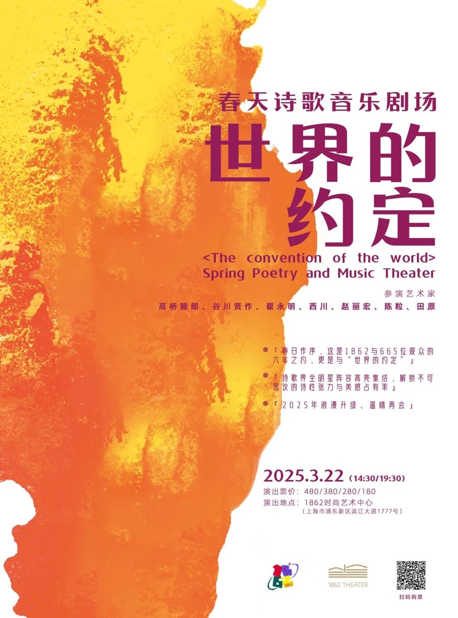 3月22日,1862时尚艺术中心将举办两场春天诗歌音乐剧场《世界的约定》演出,其中下午场(履约公益场)将邀请2019年春天诗歌音乐剧场《我把活着欢喜过了》的665位观众持原票根出席。五年后,当春风再度轻拂黄浦江岸,1862将以一场“酝酿六年的诗意”履约,纪念谷川俊太郎。