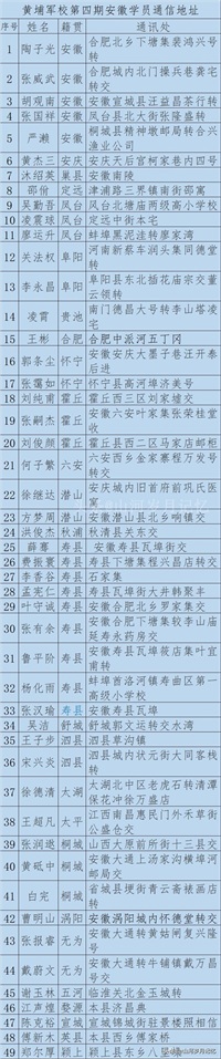 黄埔4期安徽籍学员来自安徽各地,有合肥和安庆的,也有来自大别山的,也有皖南和淮北的。廖运升是凤台县凤台县廖家湾人(现淮南田家庵区安成镇廖家湾村),寄信地址是蚌埠黑泥洼转廖家湾,只知黑泥洼在铁路线边上,不知黑泥洼到廖家湾近不近?戴蔚文是无为市洪巷镇练溪社区人,寄信地址是安徽大通转牛铺镇戴万昌号交,牛铺镇现是无为市牛埠镇,看来戴蔚文不是直接寄信回洪巷镇,而是寄到家族中人商号,再带信给家人。下图是4期安徽学员籍贯和同学录所留通信地址。