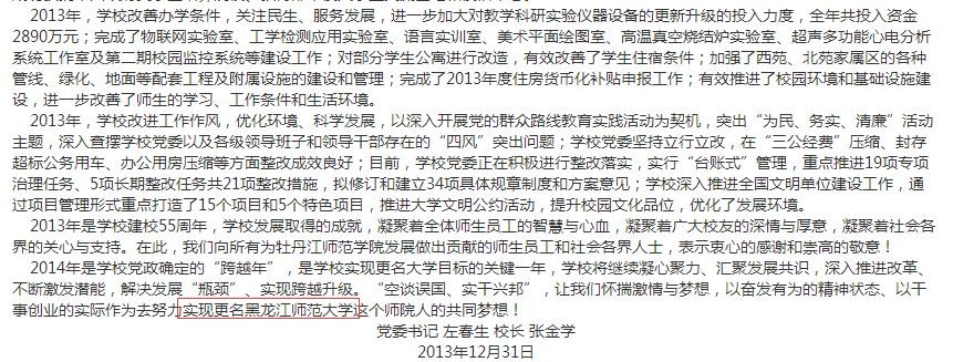 通过牡丹江师范学院官网检索“黑龙江师范大学”关键词,在2013年12月31日发布的《新年贺词》中提到“2014年是学校党政确定的“跨越年”,是学校实现更名大学目标的关键一年,......、以干事创业的实际作为去努力实现更名黑龙江师范大学这个师院人的共同梦想!”