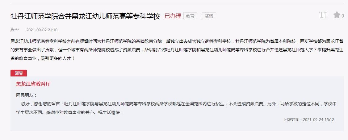 关于“牡丹江师范学院合并黑龙江幼儿师范高等专科学校”的问题,教育厅回复,“牡丹江师范学院与黑龙江幼儿师范高等专科学校两所学校都是在全国范围内进行招生,不会造成资源浪费。另外,两所学校的定位不同,学校中学生层次不同。”