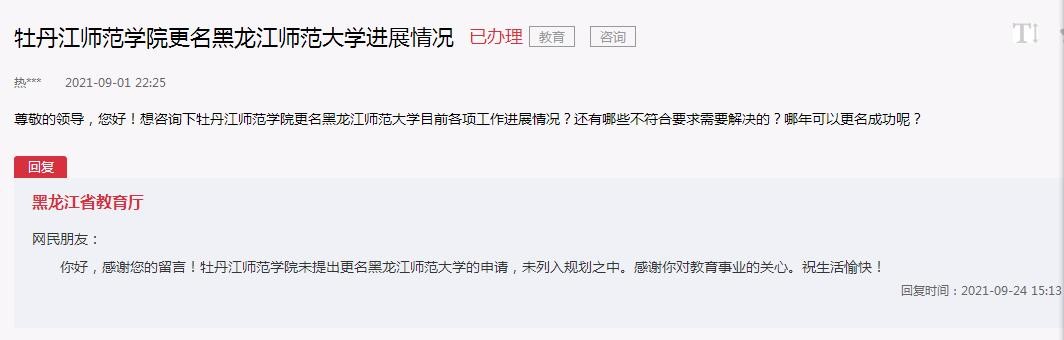 关于“牡丹江师范学院更名黑龙江师范大学进展情况”,教育厅回复,“牡丹江师范学院未提出更名黑龙江师范大学的申请,未列入规划之中。”