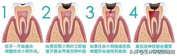 此时如果不及时治疗龋坏,将继续向深层牙体组织发展,就会出现遇冷遇热疼痛,之后形成明显龋洞。