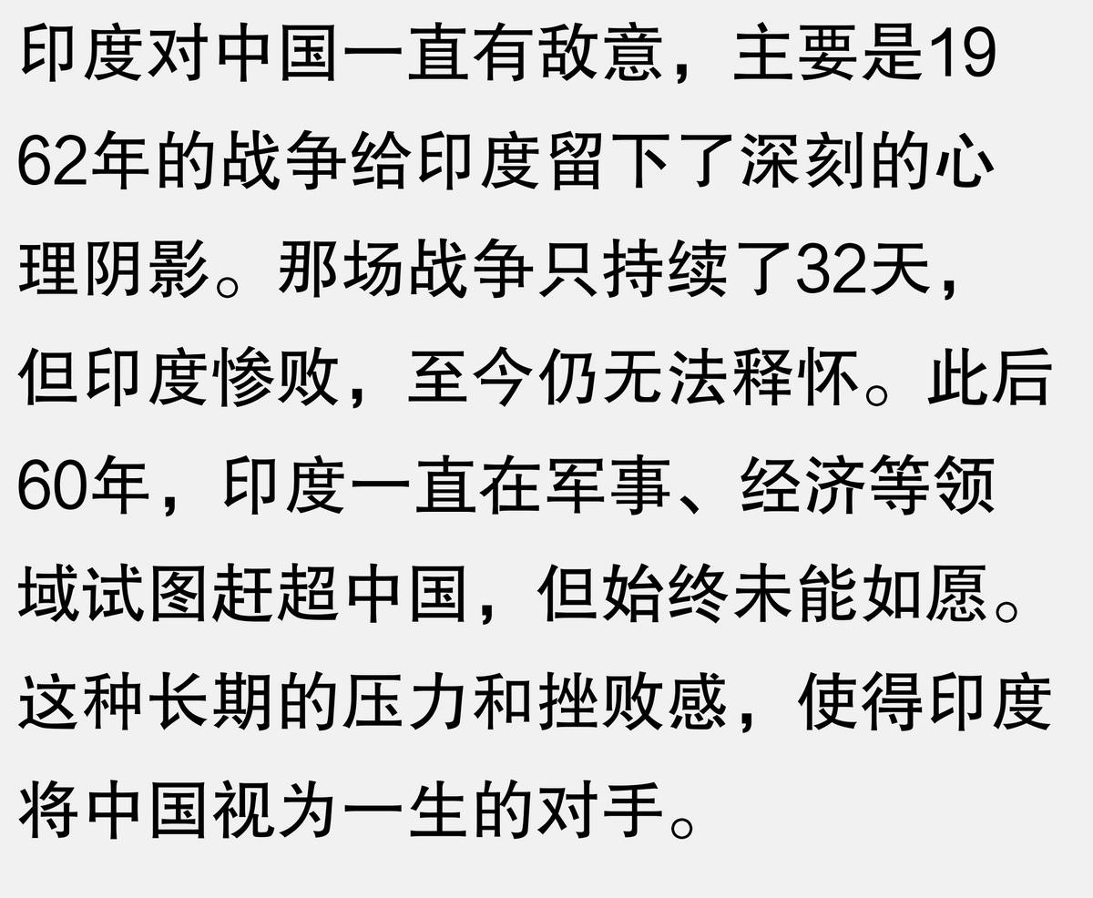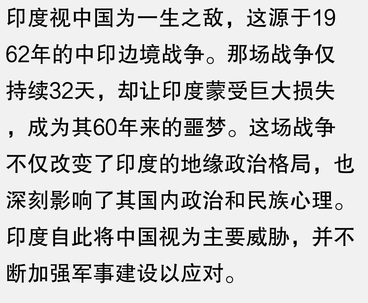 印度和中国之间的边境冲突持续了32天,印度在这场冲突中损失惨重,导致他们对中国产生了深深的敌意。此后60年,印度一直将中国视为主要威胁,不断在边境地区加强军事部署,试图通过军事手段来遏制中国的发展。然而,中国的综合国力不断提升,印度始终无法摆脱对中国的恐惧和敌视。