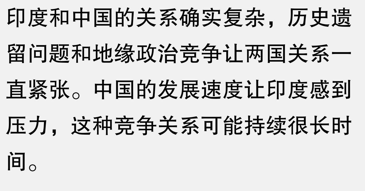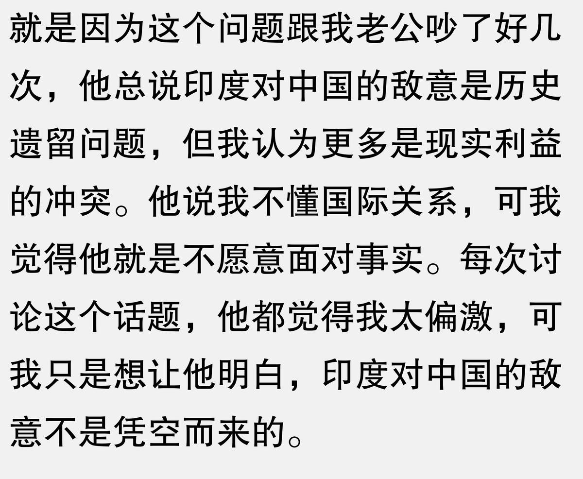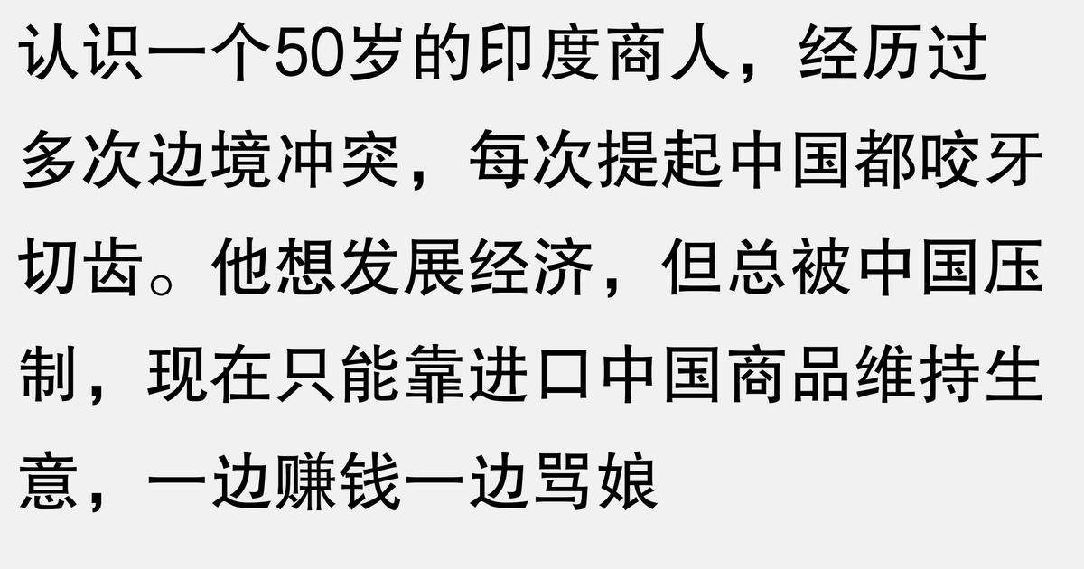 我有个朋友在印度工作,他说印度人对中国的态度很复杂。有一次他们公司请了个中国工程师来指导,结果那个工程师只用了32天就把他们研究了60年的技术难题解决了。从此以后,印度同事对中国又恨又怕,说中国人太可怕了,简直是一生之敌。
