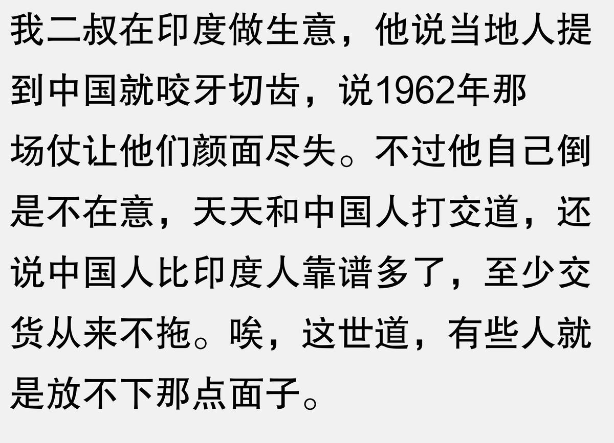 我一个亲戚,他父亲在1962年那场战争中受了伤,后来一直耿耿于怀,家里人也经常提起那段历史。现在他们住在边境附近,每天都担心安全问题,总觉得中国会再次打过来。虽然日子过得还算安稳,但那种阴影始终挥之不去。