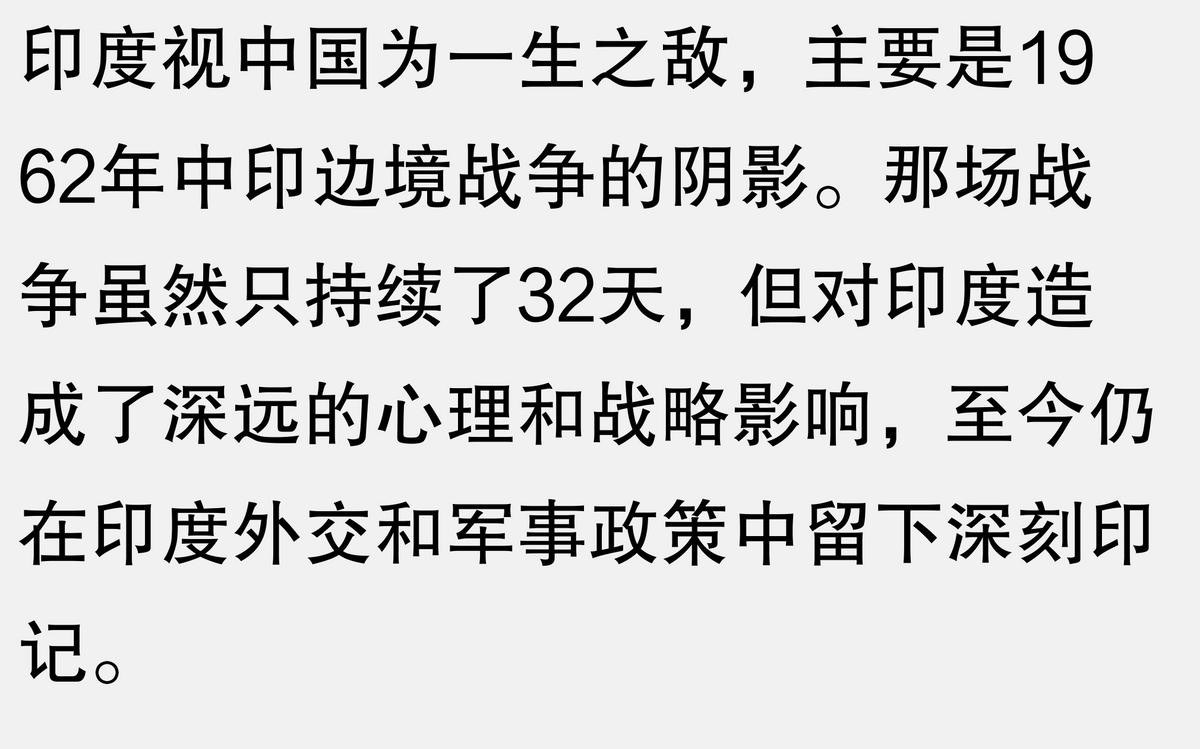 我爷爷是抗美援朝老兵,经历过那场战争。他常说,印度和中国在1962年的那场边境冲突,虽然只打了32天,但给印度留下了深刻的阴影。印度当时低估了中国的军事实力,结果被打得措手不及。从那以后,印度一直对中国心存戒备,视中国为最大威胁。这种心理阴影至今未消,影响了印度对华政策。