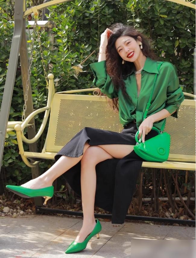 暖绿色有显白的效果,同时也能体现出穿着者良好的时尚态度,但是这样的搭配不能选错款型设计,否则就起不到这些效果了。