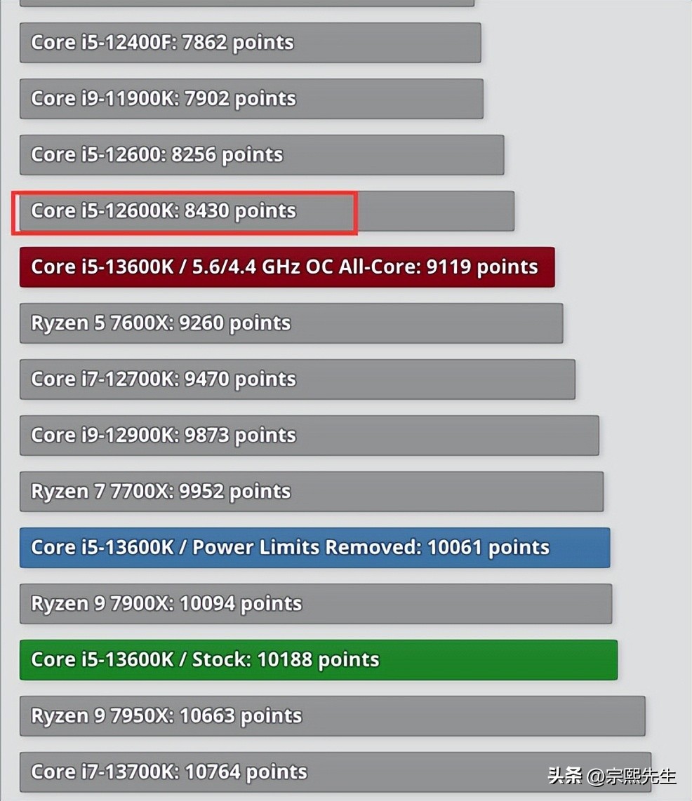 当然,对比结果肯定是毫无悬念的,Core i5-13600K的综合性能肯定是要优于Core ii5-12600K的性能,但这不是重点,重点在于Core i5-13600K的领先幅度到底有多大。