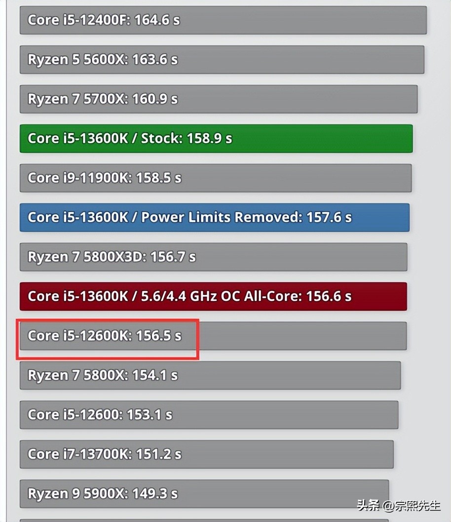 最终结果是,Core i5-12600K的用时为157秒,Core i5-13600K的用时为159秒,Core i5-12600K的成绩更优,但是如果考虑误差的因素,二者基本相等。