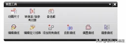 【草图工具】工具条上包含许多草图操作命令。利用这些命令能方便地对草图进行操作,常用的有【动画尺寸】、【转换至/自参考对象】、【备选解】、【编辑曲线】、【编辑定义线串】、【添加现有曲线】、【投影曲线】、【偏置曲线】和【镜像曲线】等。