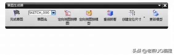 草图管理主要是指利用【草图生成器】工具条上的一些命令进行操作。如下图所示,用于草图管理的命令主要有【完成草图】、【草图名】、【定向视图到草图】、【定向视图到模型】、【重新附着】、【创建定位尺寸】和【更新模型】。