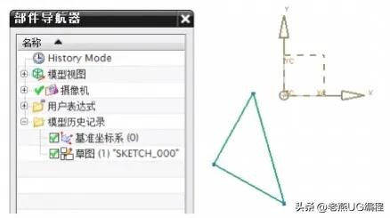草图在UG中被视为一种特征,每创建一个草图,【部件导航器】都将添加一个对应的草图特征。如下图所示,在绘图区中的草图(三角形)与左边【部件导航器】中的【草图(1)“SKETCH 000”】相对应。因此,部件导航器所支持的任何编辑功能对草图同样有效。