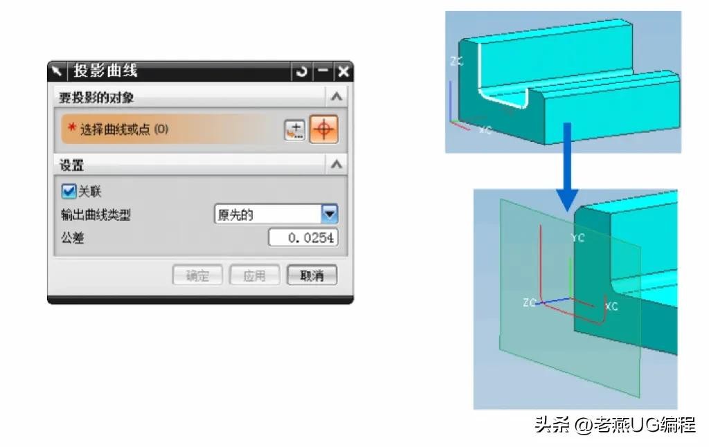 使曲线按照草图平面的法线方向进行投影,从而成为草图对象,并且原曲线仍然存在。可以投影的曲线包括所有的二维曲线、实体或片体边缘。