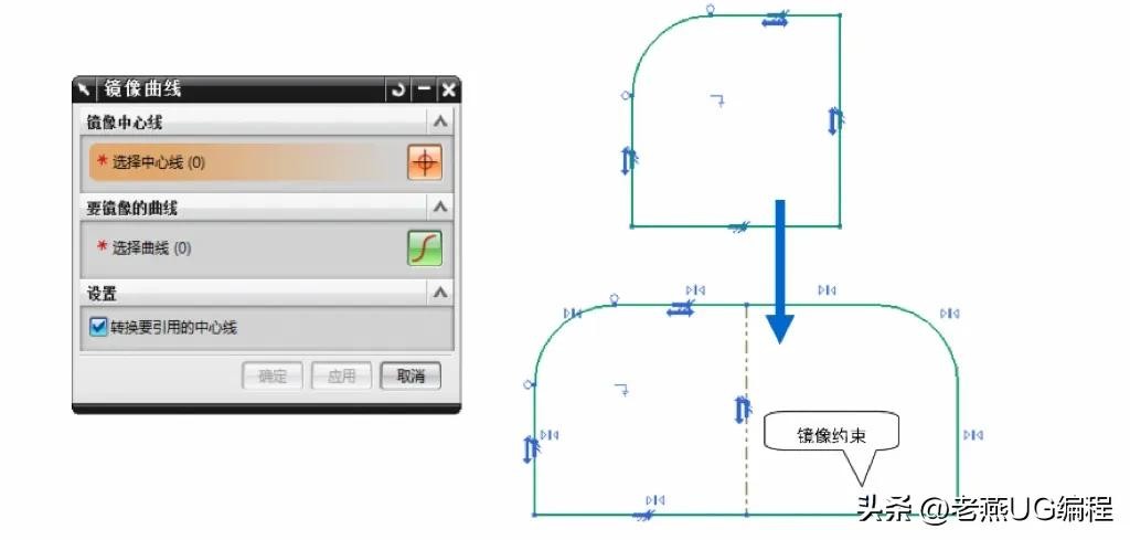 该命令是较常用的草图操作命令。在绘制对称图形时,只需绘制一半的曲线,然后通过该命令生成关于中心直线对称的曲线,最后对曲线进行镜像约束。