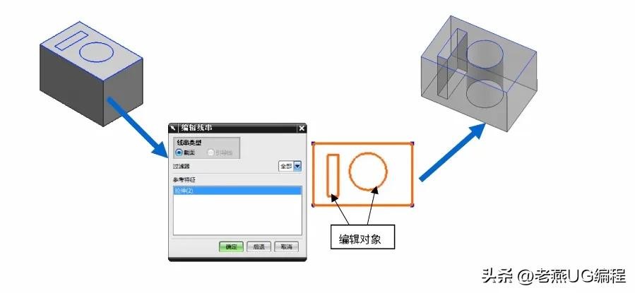 草图一般用于拉伸、旋转等扫掠特征,因此多数草图本质是定义特征截面线。通过【编辑定义线串】可以增加或去掉某些曲线,从而改变截面形状。