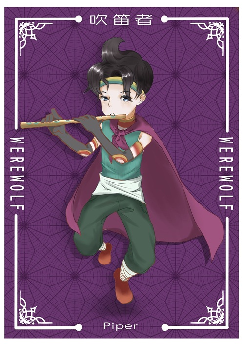 吹笛者:独立阵营,被预言家查验告知是好人。每晚有单独轮次,首夜睁眼后可以选择魅惑0-1名玩家,第二天开始每晚可以选择魅惑0-2名玩家,不能选自己。所有被魅惑过的玩家每晚都有集体睁眼互认的轮次,可以打手势讨论吹笛者是谁。白天所有玩家正常发言。当场上所有存活玩家均已被魅惑时,吹笛者单独获胜。吹笛者进入情侣链,失去魅惑功能,成为普通村民没有功能,默认形成第三方(即丘比特和情侣组成的第三方阵营)。