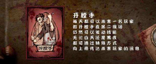 开膛手杰克:第三方阵营,每晚单独睁眼,必须杀死一人。女巫看不到杰克的刀法,但是守卫的守护可以防止玩家被杰克杀害。杰克被预言家验到显示为好人。