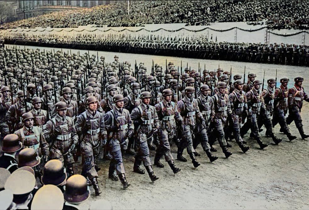 德国伞兵部队气宇轩昂地走过阅兵检阅台,他们是战场上令对手胆寒的战士,有“绿色魔鬼”的绰号。