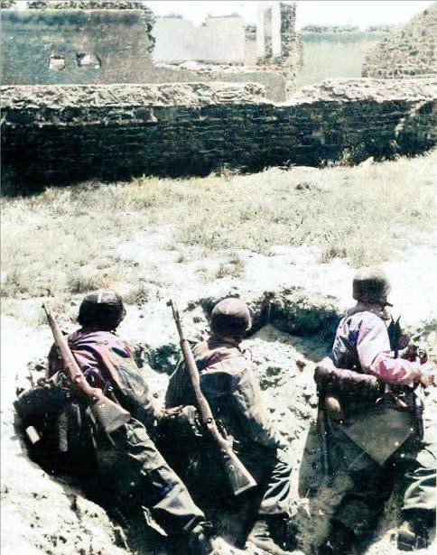 散兵坑里观察敌情的德国伞兵 他们身上的kar98k步枪毫无疑问不具备对对面敌人的压制能力