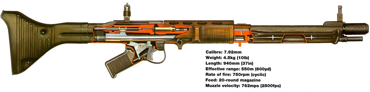 或许是由于德国伞兵在战斗当中的巨大损失让德国空军有那么一点歇斯底里。他们对新枪的技术要求苛刻到近乎病态。他们要求该枪火力仅次于轻机枪,并且射程远精度高杀伤力强。同时为了满足方便在飞机内携带与空降,该枪又被要求不能太长并结构坚固。加装刺刀后可以进行肉搏战,加装瞄准镜后可以作为狙击步枪使用。