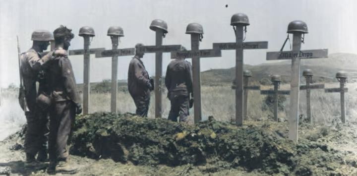 克里特岛上德国伞兵的简易坟墓 此战带来的惨重损失促进了伞兵专属枪械的研发